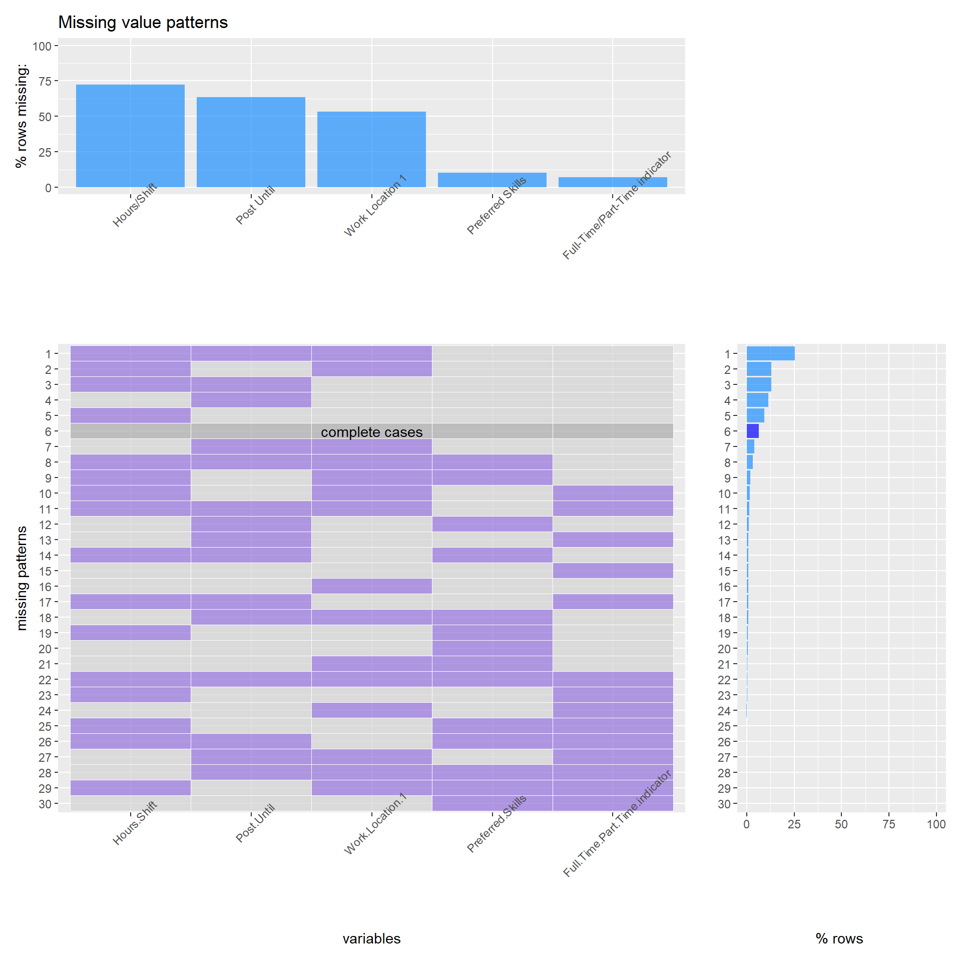 From above plot we can observed that there are 30 different patterns. There are near 7% rows recorded as complete cases.The most common pattern is missing of hours shift, post until and work location 1, about 25% of total rows. And the amount of the pattern whose missing is hours shift and work location 1 is around 12.5% of total rows, which is similar to the amount of the pattern whose missing is hours shift and post until. The reason is that for hours shift, many job postings do not have uniform standards; for post until, blank means post until filled; and for work location 1, many job postings have given their work locations in variable “Work Location” and do not one more specific work location.