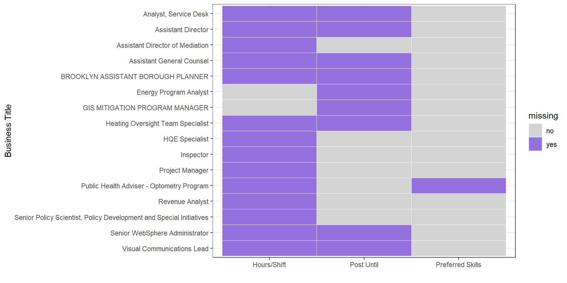 Since Business title is one of the most important variables,we choose some records to analyze the relationship and check if our decision is right. From this graph we can find most of this business titles miss “Hours/Shift”, but for variable “Preferred Skills”, almost all business titles have a value. Thus, our decision is right.