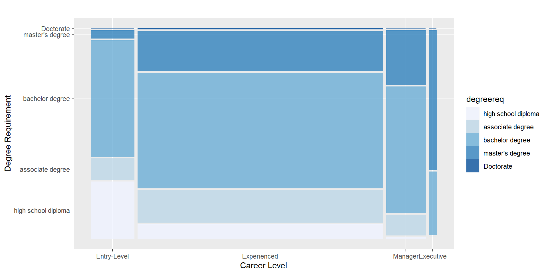 In this mosaic graph, it shows when career level changes from “entry-level” to “executive” (from low level to high level), the percent of high school diploma requirement become smaller and smaller, and the percent of master’s degree requirement become larger and larger. The percent of Doctorate requirement is very low for all of these career levels. Also, the percents of bachelor degree requirement and associate degree requirement are similar in career levels “entry-level”, “Experienced”, and “Manager”. But in career level “executive”, the percents of both degree requirement are almost 0, almost all degree requirements are from master’s degree and bachelor degree. Adding all these information together, we find higher career level cannot substitute for higher degree level, instead, when job postings’ career level become higher, their degree requirements also become higher and do not need people whose degree is low.