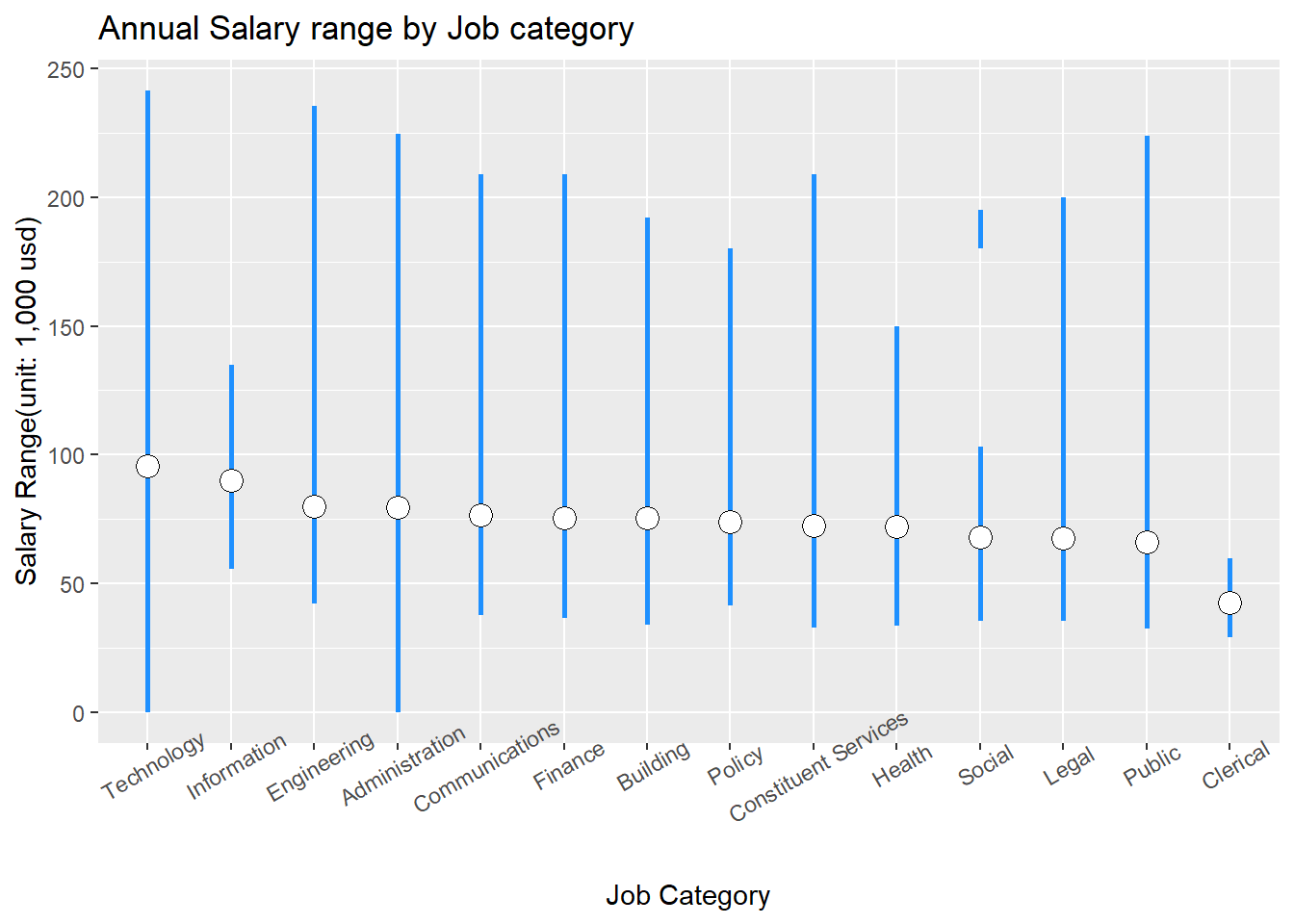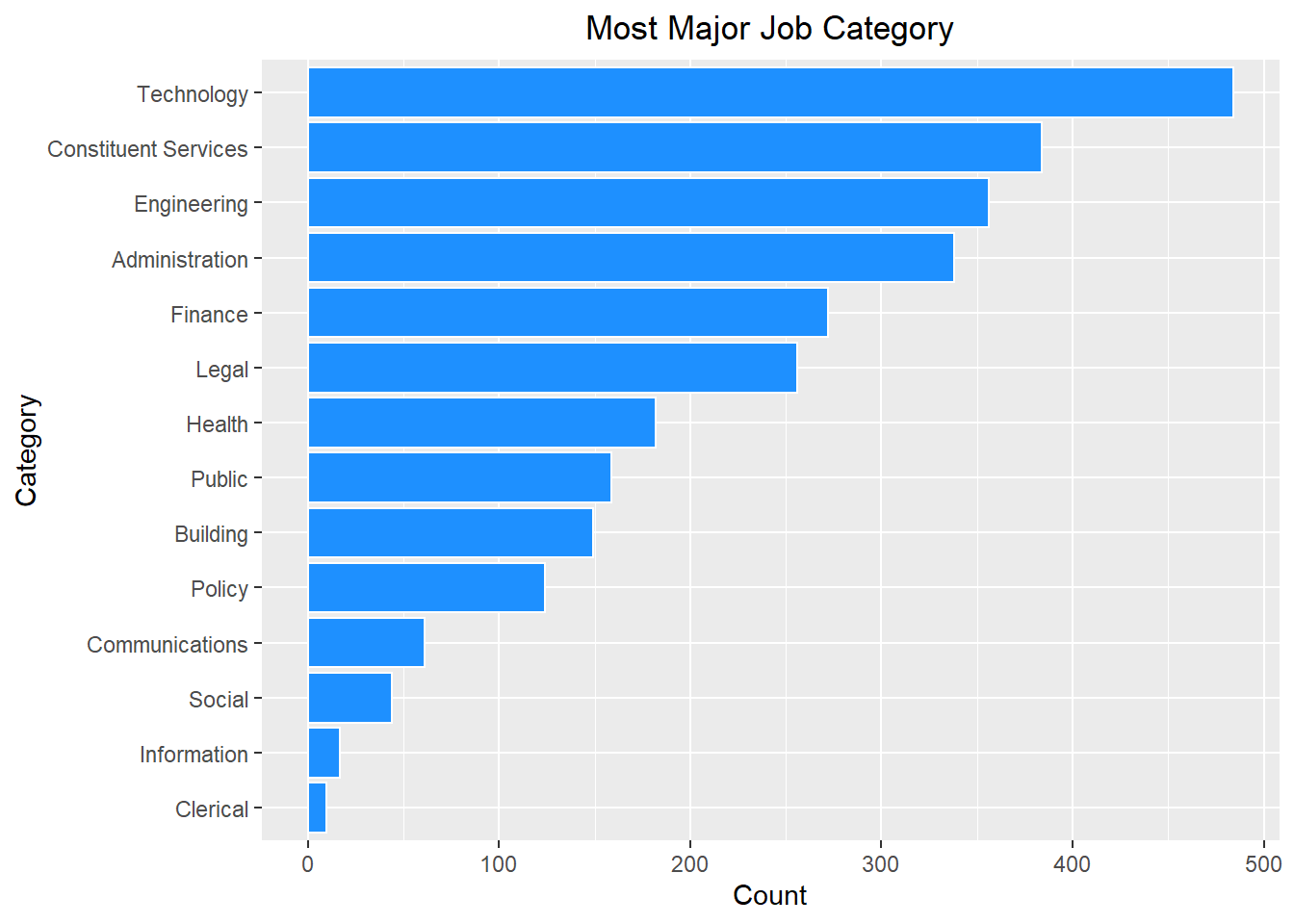 From the graph above, we can find that the number of job posting for “Technology” is largest, which is more than 450, and the number of job posting for “Clerical” is smallest. For “Technology”, “Constituent Services”, and “Engineering”, these three job categories have the top three number of job postings. If people want to choose jobs from these categories, they will have more choices than people who choose from “Social”, “Information”, and “Clerical”.