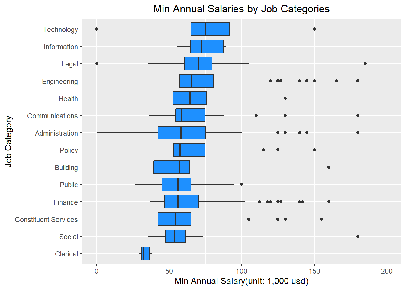Sometimes it is not enough for job seekers to just know the information of minimum salary. Here we plot this graph to show the mean salary, the maximum salary, and the minimum salary job seekers can get from each job category. Combining with the first graph “Min Annual Salaries by Job Categories” in section 5.2, for job categories “Engineering”, “Administration”, “Constituent Services”, “Building”, “Finance”, and “Social”, they rank higher based on mean salary than they rank based on median of minimum salary. However, for job category “Legal”, although it ranks third in terms of median minimum salary, it has the second lowest number of mean salary, and the value of its mean salary is close to its median of minimum salary. This information shows job seekers who want to work in “Legal” job category can get a better minimum salary guarantee, but the salary they eventually get will not change much.