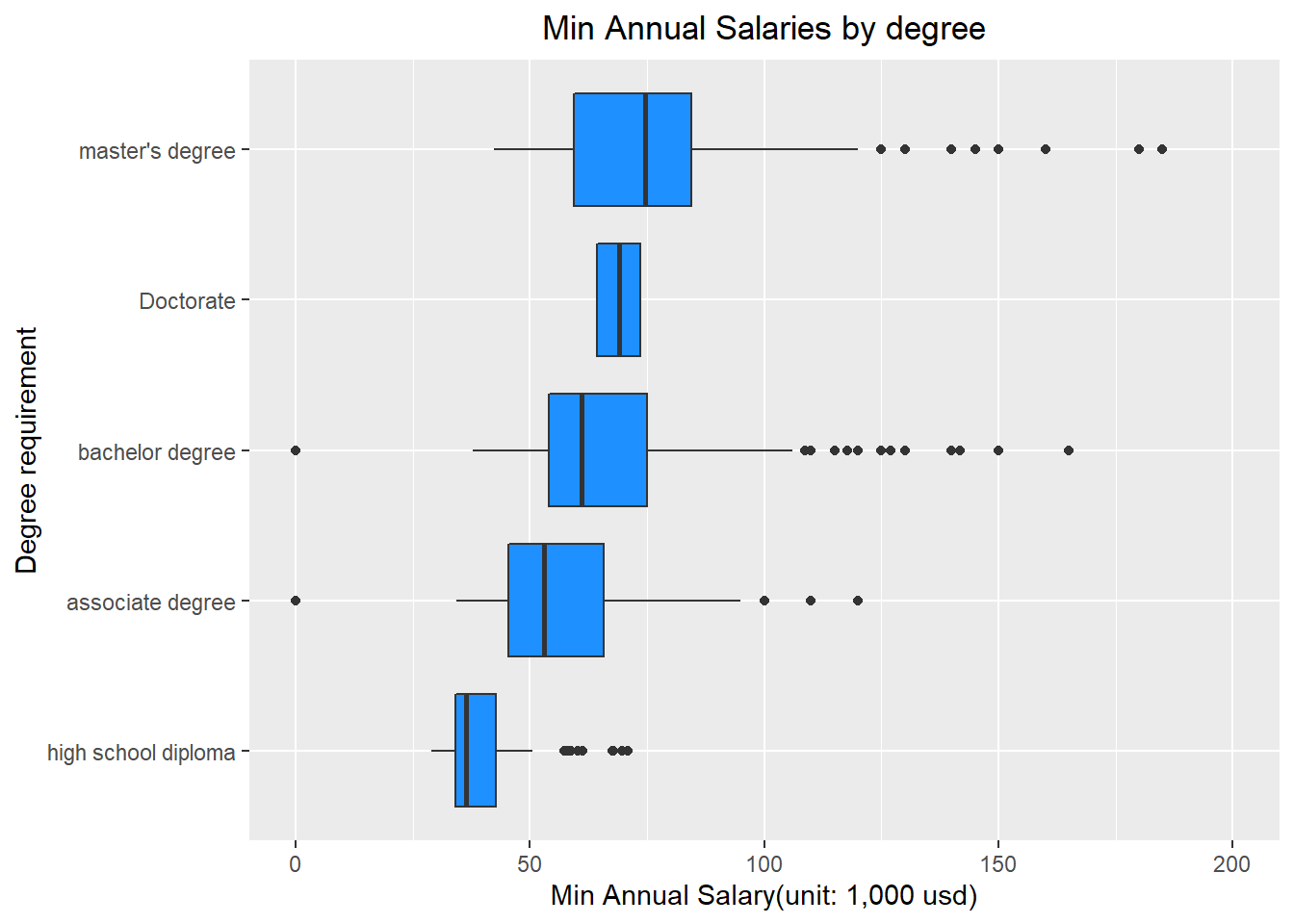 From this graph, it shows a trend that except “Doctorate” (since the number of job postings whose degree requirement needs “Doctorate” is very small), the higher the degree requirement, the higher the salary. For job postings that need master’s degree, the median of minimum annual salary is around 75000. But for those job postings that need associate degree, the median of minimum annual salary is just around 50000. Therefore, it is always beneficial for job seekers to improve their education level before looking for a job.