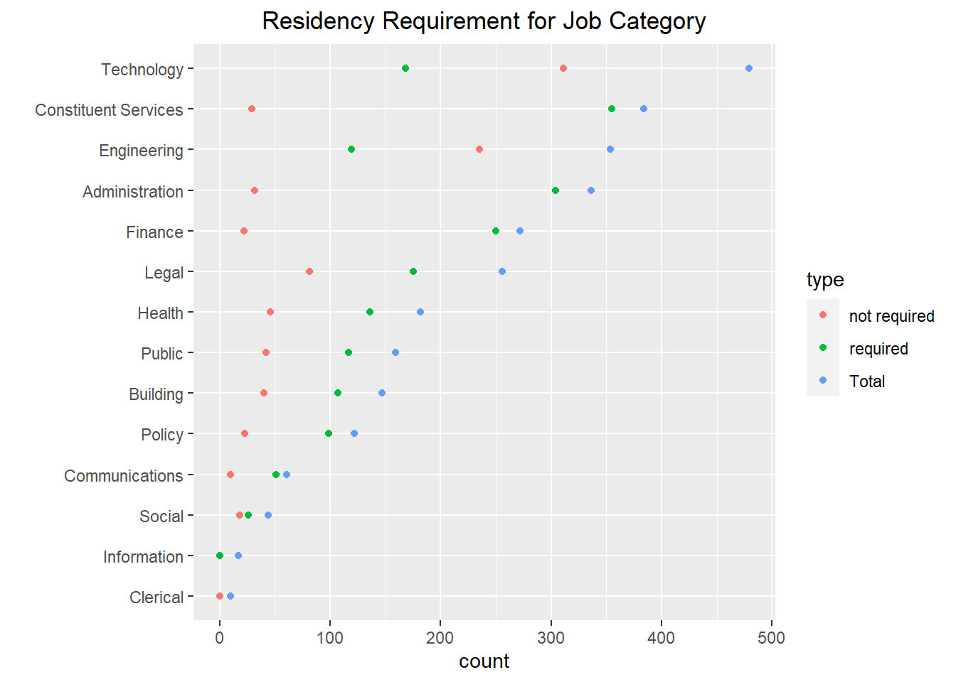 In this graph, for each job category, it shows the amount of job postings that require the residency requirement and the amount that do not require, and the total amount. We can find for job category “Information”, all of its job postings do not have residency requirement, and for job category “Clerical”, all of its job postings need residency requirement. What’s more, we notice that for most of the job categories, the amount of “required” is greater than the amount of “not required”. Only in job categories “Technology”, “Engineering”, and “Information”, the amount of job postings that do not require New York residency requirement is greater than the amount that require. This information shows now New York City provide a convenient employment environment for some international students whose major is about “Technology” or “Engineering”.