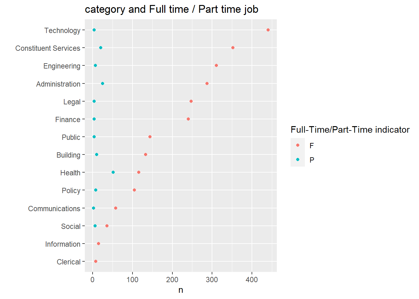 In this graph, we show the amount of full-time jobs and the amount of part-time jobs for each job category. It shows for job categories “Information” and “Clerical”, they just have full-time jobs. For all job categories, the amount of full-time jobs are greater than the amount of part-time job. It means that full-time work seems to have gone mainstream in New York. What’s more, we can find job category “Health” has the most number of part-time jobs. Thus, if you prefer to find a part-time in New York, “Health” category can provide more choices to you.