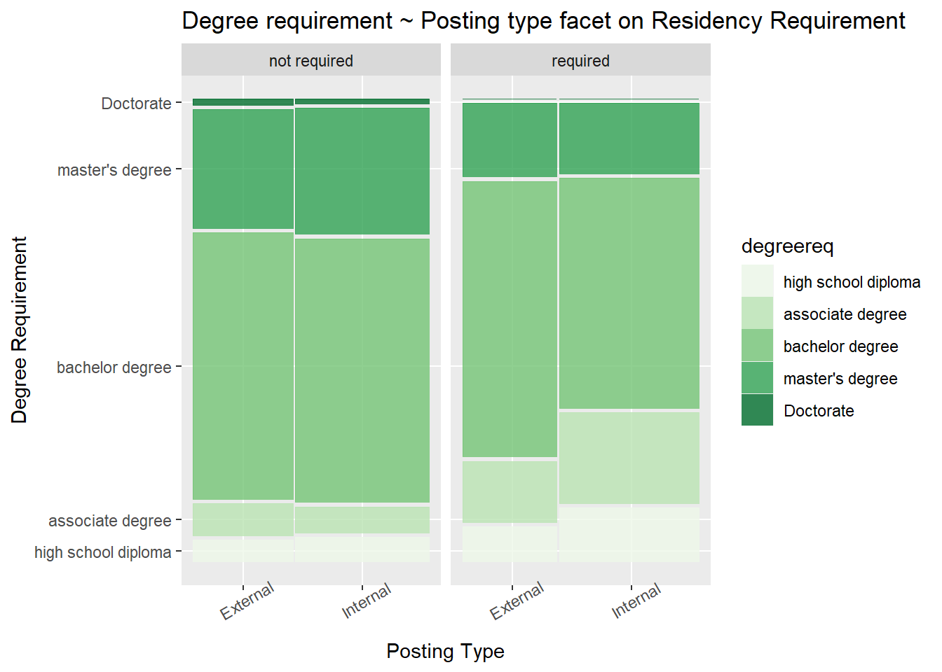 In this mosaic graph, we analyze the relationship between degree requirement and posting type & residency requirement.