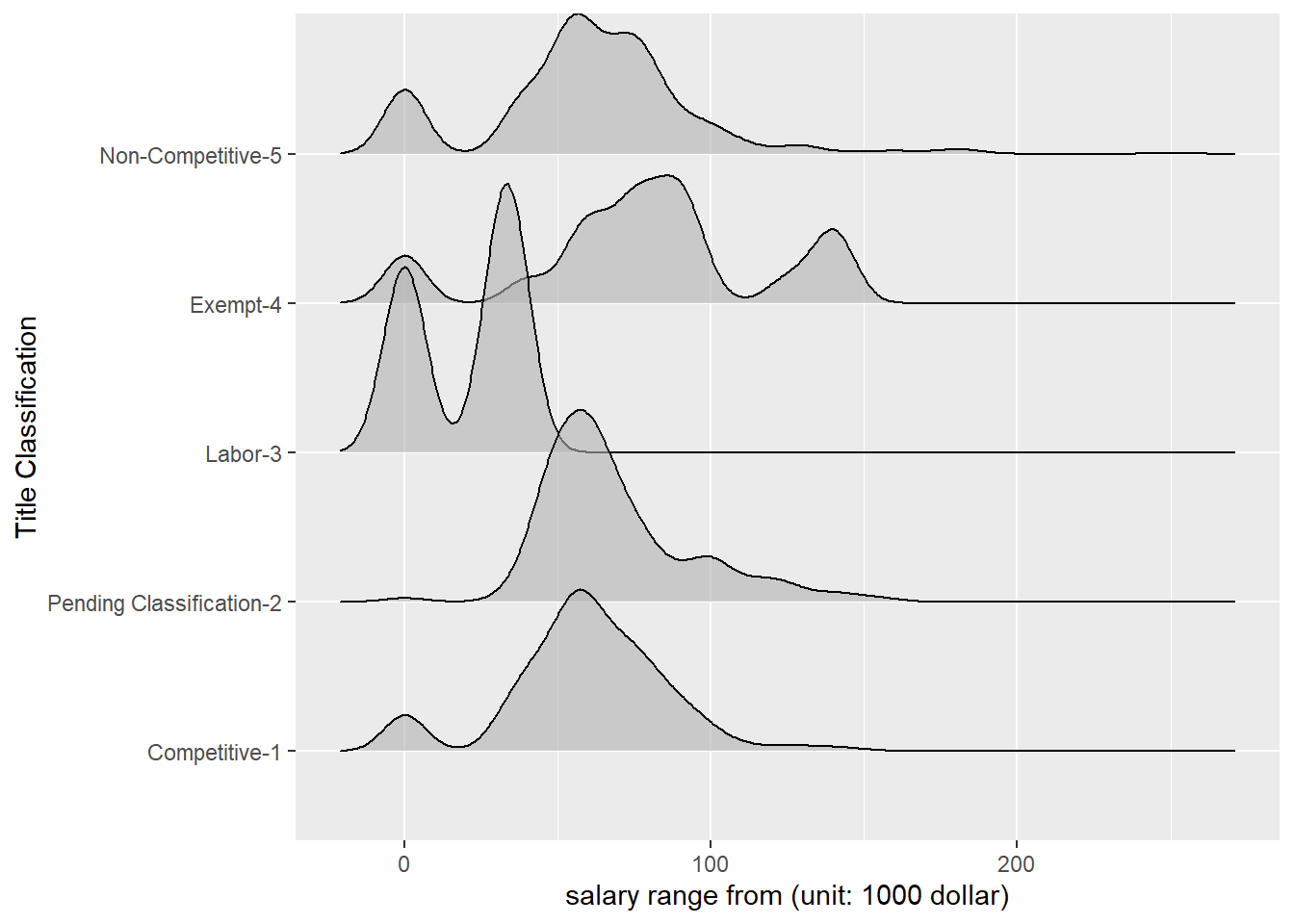 In this ridgeline plots, one for each kind of “Title Classification”, it shows us how the number of job postings of each title classification changes with the lower bound of salary range. We can find that for job postings whose title classifications are “Competitive-1”, “Pending Classification-2”, and “Non-competitive-5”, their low bound of salary range are concentrated around 50,000 dollars. “Exempt-4” is more likely to get a higher salary, with one peak near 100,000 dollars and one peak near 150,000 dollars. However, for job postings whose title classification is “Labor-3”, most of it low bound salary range is less than 50,000 dollars, which may because it is unskilled job.
