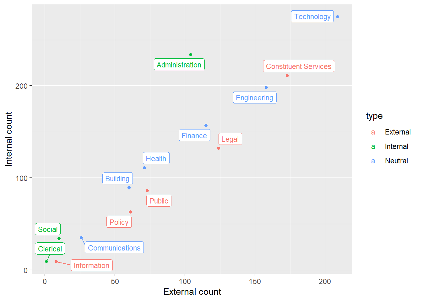 In this graph, for each job category, we set some categories are more “external” if its number of external job postings is greater than the number of internal job postings times 0.8, some categories are more “internal” if its number of external job postings is less than the number of internal job postings times 0.6, and else categories are “neutral”. From the graph, we can find for job categories “Clerical”, “Social”, and “Administration”, these categories are more “internal”. For job categories “Information”, “Policy”, “Public”, “Legal”, and “Constituent Services”, they are more “external”. Other categories are “neutral”. Thus, for job seekers who are not city employees now, it is difficult to work in Administration.
